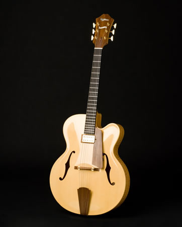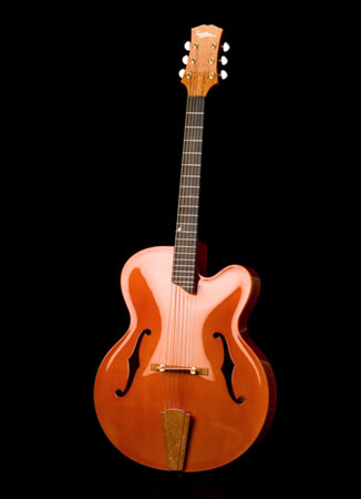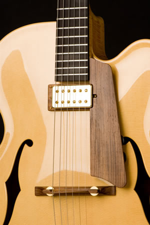 The Contessa is the distilled essence of the classic archtop guitar. Unadorned and understated, it’s elegant simplicity, sensuous edges and purity of form allow the senses to appreciate the downright sexiness of a hand carved archtop guitar. It’s visual purity is echoed by the purity of tone. Clean, rich tonality springs forth in both acoustic and electrified configurations. Click here to see features and options.